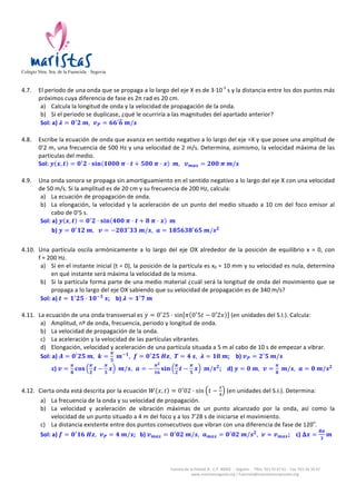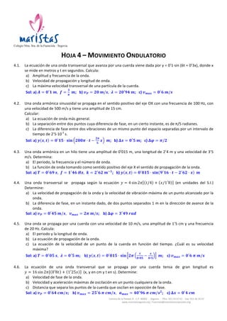 El documento contiene 11 ejercicios sobre ondas y movimiento ondulatorio. Los ejercicios cubren temas como ecuaciones de ondas, amplitud, longitud de onda, velocidad de propagación, funciones de onda, aceleración y velocidad de partículas. Cada ejercicio presenta un problema y su solución detallada.