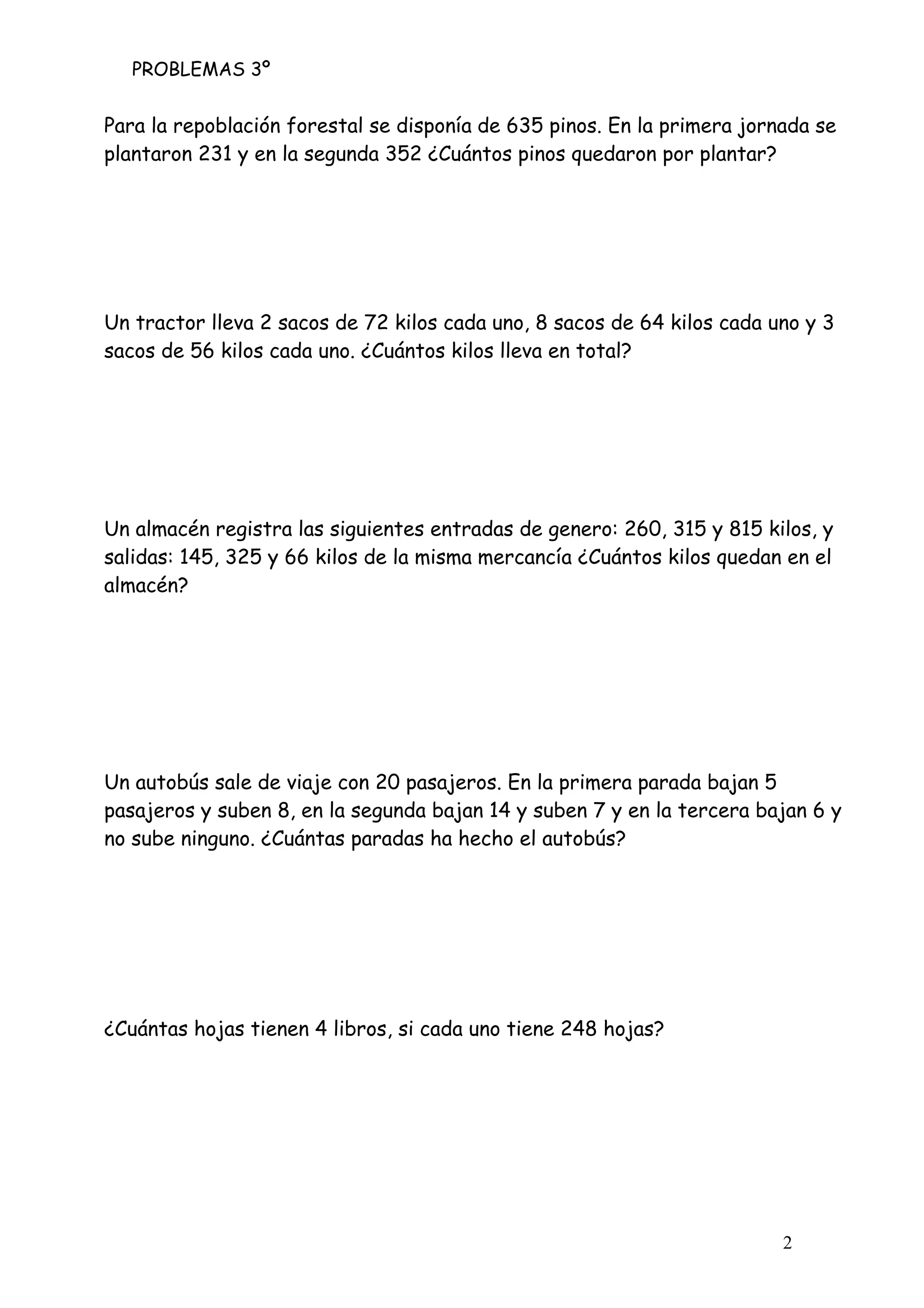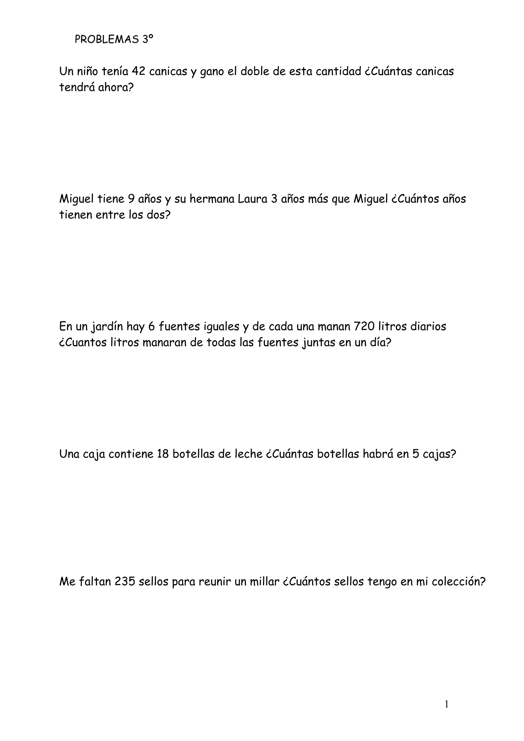 Este documento contiene 18 problemas matemáticos de primaria sobre sumas, restas, multiplicaciones y divisiones. Los problemas involucran cantidades como canicas, años, litros de agua, kilos de diferentes productos, monedas, pasajeros en autobuses y más, y piden calcular resultados como la cantidad total, la cantidad que queda, la diferencia entre cantidades y más.