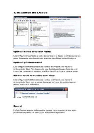 Este documento describe las diferentes pestañas y opciones de configuración disponibles en el administrador de dispositivos de Windows para unidades de disco, unidades de DVD/CD-ROM, y adaptadores de red. Detalla las opciones para optimizar el rendimiento y extracción rápida de unidades de disco, y explica las pestañas de volúmenes, controladores, y configuración de audio para unidades de DVD/CD-ROM. Finalmente, cubre las dos pestañas de opciones avanzadas y administración de energía disponibles para adaptadores de red.