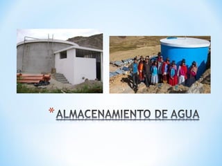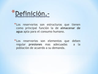 Los reservorios almacenan agua para consumo humano y regulan la presión de acuerdo a la demanda de la población. Pueden ser de cabecera para abastecer directamente a la población, flotantes para regular presión, o elevados con una cuba y fuste para aumentar la altura dinámica y el flujo de agua en la red de distribución. La geometría de los reservorios puede ser cuadrada, rectangular, cilíndrica u otra forma, dependiendo del diseño arquitectónico.