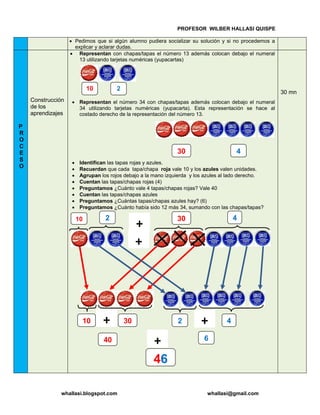 El documento describe una lección sobre la suma descomponiendo números. Los estudiantes aprenderán a descomponer números usando chapas de colores que representan decenas y unidades. Practicarán sumando números descompuestos en chapas a través de ejercicios de juego y problemas. La lección concluye con los estudiantes resolviendo problemas adicionales y comparando sus soluciones.