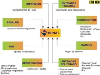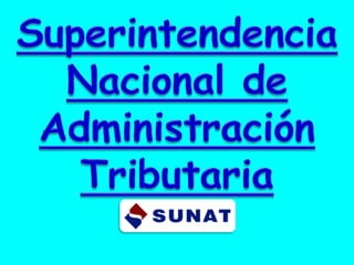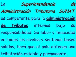 La Superintendencia de Administración Tributaria (SUNAT) es la entidad competente para la administración y recaudación de impuestos internos en el Perú. La SUNAT tiene facultades de recaudación, fiscalización y sanción tributaria. Su labor es establecer una tributación sólida y permanente para el país.