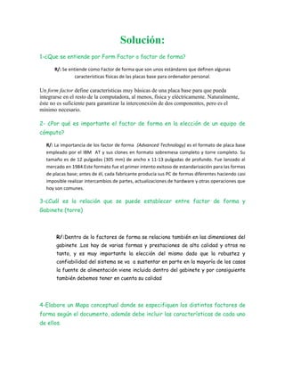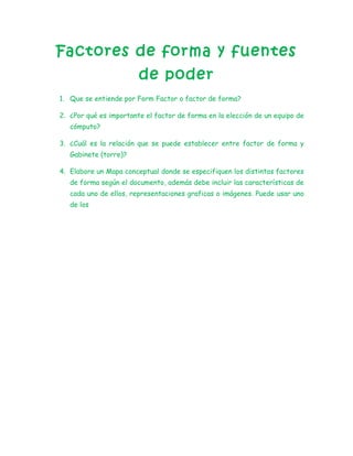 El documento describe los diferentes factores de forma para placas base de computadoras personales. Explica que el factor de forma define características físicas mínimas para que la placa base se integre correctamente con otros componentes. Luego detalla los factores de forma más comunes como AT, Baby AT y ATX, describiendo sus características clave como tamaño, ubicación del zócalo de la CPU y conexiones de alimentación. Finalmente, presenta un mapa conceptual que resume visualmente los diferentes factores de forma y sus características.