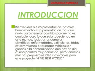 Este documento presenta una introducción a un proyecto llamado "4 THE BEST WORLD" que busca generar cambios positivos relacionados con problemas ambientales. Explica los propósitos del proyecto, que incluyen lograr un cambio en la forma de pensar sobre el medio ambiente y conocer términos e información clave. También resume la clasificación de residuos, sus orígenes, y los contenedores para basura. Finalmente, destaca las tres erres - reducir, reutilizar y reciclar - como principios fundamentales para cuidar el plan