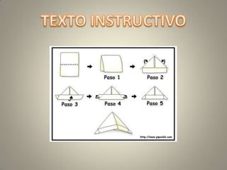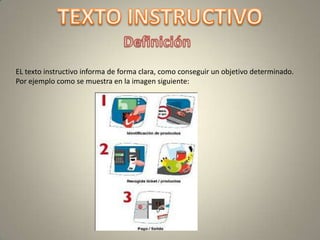 El documento describe la estructura y características de un texto instructivo. Explica que un texto instructivo informa de forma clara cómo lograr un objetivo específico a través de tres pasos: 1) informar sobre el objetivo, 2) detallar los materiales necesarios, y 3) enumerar los pasos claros para lograr la meta usando conectores como "primero" y "luego". También usa imágenes, lenguaje imperativo y preciso, y posiblemente términos técnicos relacionados al tema.