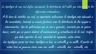 Este documento describe tres tipos principales de topologías de red: topología en bus, topología en anillo y topología en estrella. Explica que la topología de red se define como la cadena de comunicación usada por los nodos de una red para comunicarse y proporciona detalles sobre cómo funciona cada tipo de topología, incluido que en una topología en bus todos los nodos se conectan a un solo cable, en una topología en anillo los nodos se conectan en un cable en forma de anillo cerrado y en una topología en estrella