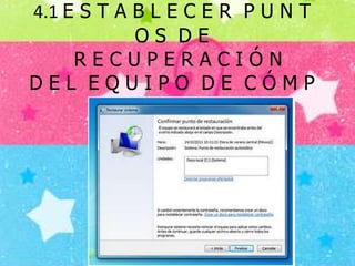 Este documento describe cómo crear y restaurar puntos de restauración del sistema, reinstalar el sistema operativo y software, e instalar controladores. Explica los pasos para establecer puntos de recuperación del sistema, recuperar el sistema operativo a un punto anterior, reinstalar el sistema operativo desde un disco, e instalar software y controladores después de una reinstalación.