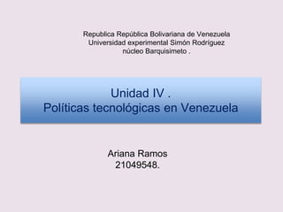 Este documento discute las políticas tecnológicas en Venezuela. Explica que las políticas tecnológicas deben establecer objetivos claros para la ciencia y tecnología de un país y que los organismos trabajen para cumplir esos objetivos. Sin embargo, Venezuela no ha podido mantener una política tecnológica estable que contribuya al crecimiento tecnológico, y aunque tiene varios organismos tecnológicos, la mayoría no cumplen con sus objetivos y no realizan actividades relacionadas con la ciencia y