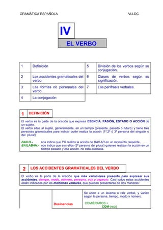 Este documento describe las características fundamentales del verbo en español. Explica que el verbo expresa la acción, pasión o estado del sujeto y puede indicar el tiempo, modo, número y persona. Además, describe los accidentes gramaticales del verbo como el tiempo, modo, número, persona, voz y aspecto. Finalmente, clasifica los verbos según su significado y conjugación.