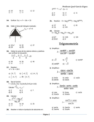 El documento presenta 12 problemas de álgebra y trigonometría resueltos por el profesor José García López. Los problemas incluyen hallar dominios, rangos y soluciones de funciones, ecuaciones y desigualdades, así como cálculos trigonométricos.