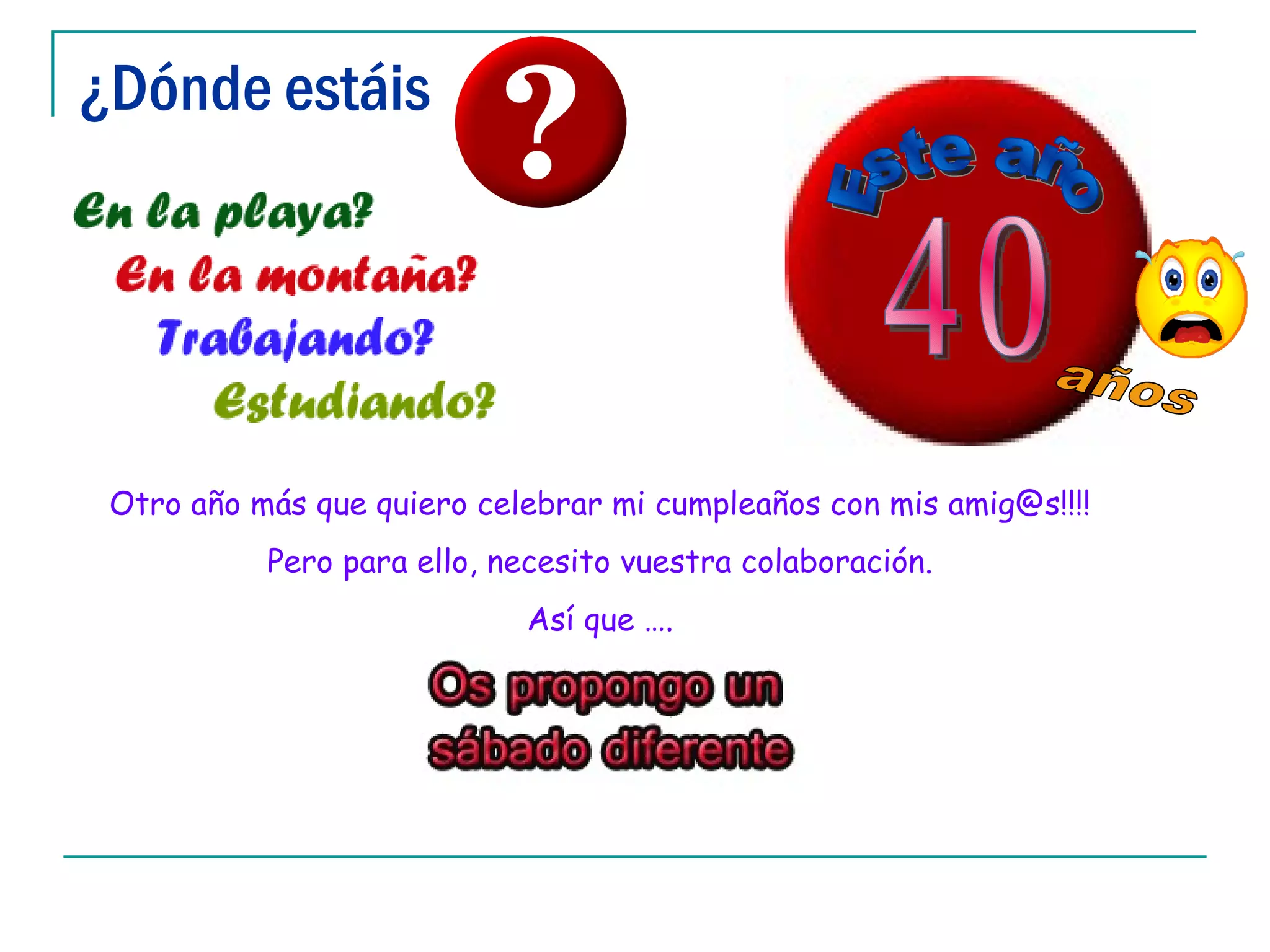 La persona desea celebrar su cumpleaños número 40 con sus amigos y pide su colaboración para organizarlo.