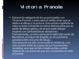 El documento proporciona información biográfica y sobre la obra de la artista española Victoria Francés. Se detalla que es licenciada en Bellas Artes y se dedica al dibujo y la pintura en un estilo gótico, retratando a menudo mujeres con características vampíricas. Su éxito ha ido en aumento en los últimos años, con miles de copias de sus ilustraciones vendidas en todo el mundo. Algunas de sus obras más destacadas son la trilogía Fávole y las ilustraciones para Angel Wings.