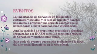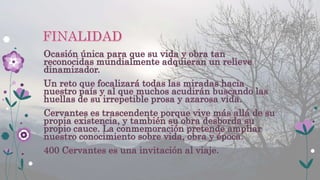 Este documento proporciona una lista de enlaces relacionados con las conmemoraciones del 400 aniversario de la muerte de Miguel de Cervantes en 2016. Los enlaces incluyen el sitio web principal de los eventos conmemorativos, videos promocionales, noticias sobre exposiciones y eventos interactivos, y páginas del gobierno que describen las iniciativas culturales para celebrar la vida y obra de Cervantes.