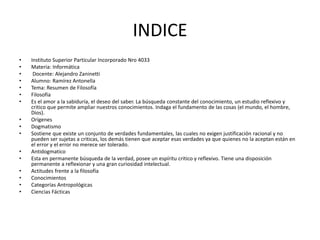El documento habla sobre la filosofía. La filosofía es el amor a la sabiduría y la búsqueda constante del conocimiento a través de un estudio reflexivo y crítico. Examina el origen y fundamento de cosas como el mundo, el hombre y Dios. Describe dos enfoques a la filosofía: el dogmatismo, que sostiene verdades fundamentales sin justificación racional, y el enfoque antidogmático, que busca constantemente la verdad a través de un espíritu crítico.