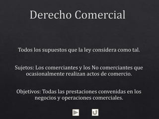 El documento habla sobre la clasificación de los actos de comercio. Explica que los actos de comercio se clasifican en naturales, por conexión y por disposición de ley. Además, los actos de comercio se caracterizan por comprar para vender y en lo jurídico el comercio equivale a la circulación de bienes, dinero y valores.