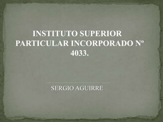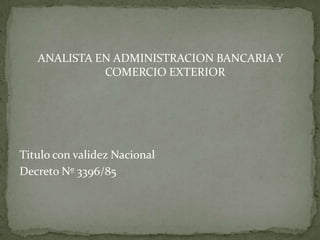 Este documento presenta un título de Analista en Administración Bancaria y Comercio Exterior otorgado por el Instituto Superior Particular Incorporado No 4033 a Sergio Aguirre. Describe las áreas en las que un analista con este título podría trabajar, como direcciones provinciales de comercio exterior o bancos. También resume los cursos requeridos para cada uno de los tres años de la carrera.