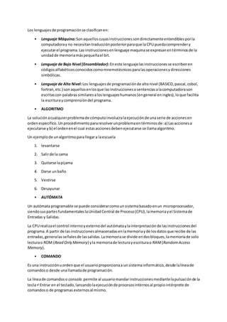 Este documento presenta varios conceptos básicos de programación como algoritmos, autómatas, comandos, secuencias de comandos, programación por procedimiento y diseño de programas. Todos estos conceptos están relacionados con el algoritmo ya que describen los pasos y procedimientos para resolver problemas de manera ordenada y eficiente mediante instrucciones de programación.