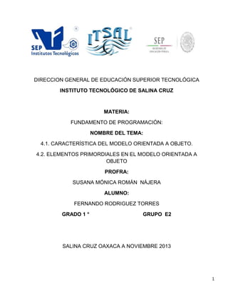 Este documento presenta los temas de las características del modelo orientado a objetos y los elementos primordiales de este modelo. Explica que el modelo orientado a objetos ofrece ventajas como la robustez, extensibilidad, reutilización y eficiencia. Luego describe elementos clave como la abstracción, encapsulamiento, herencia, polimorfismo y modularidad. El objetivo es proporcionar una mejor comprensión de este importante paradigma de programación.
