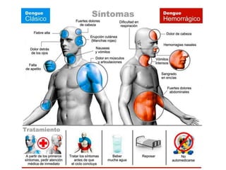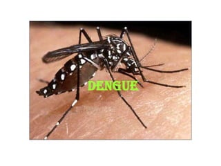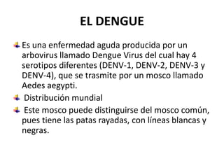 El dengue es una enfermedad causada por cuatro serotipos de virus dengue transmitidos por la picadura del mosquito Aedes aegypti. El mosquito pasa por etapas acuáticas y aéreas en su ciclo de vida. Los síntomas del dengue clásico incluyen fiebre alta, dolores musculares y de cabeza. La forma hemorrágica puede causar sangrado y afectar la coagulación de la sangre. El diagnóstico se realiza mediante pruebas de anticuerpos en muestras tomadas entre el día