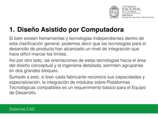 Este documento describe los sistemas CAD y sus clasificaciones. Explica los diferentes tipos de sistemas CAD 2D y 3D, incluyendo wireframes, superficies y sólidos. También cubre temas como la ingeniería inversa, la parametrización, la simulación y la gestión de la información del producto en los sistemas CAD.