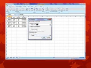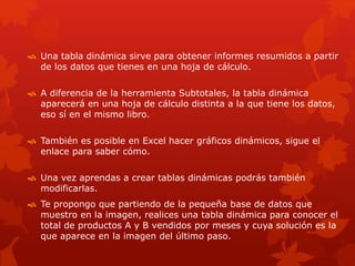 El documento explica cómo crear tablas y gráficos dinámicos en Excel a partir de datos en una hoja de cálculo. Detalla los pasos para generar una tabla dinámica que muestre el total de productos vendidos por mes, así como cómo crear gráficos dinámicos a partir de los datos de una tabla dinámica existente.