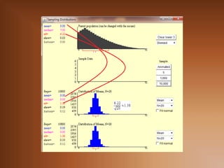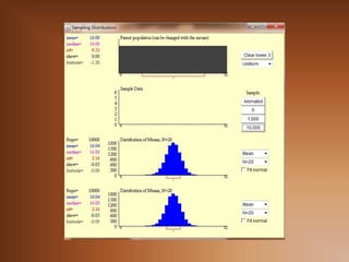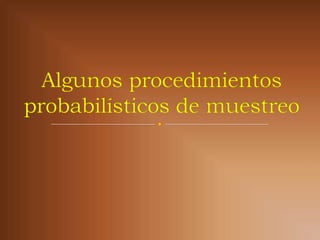 Este documento trata sobre la inferencia estadística y el muestreo. Explica que la inferencia estadística consiste en extraer conclusiones sobre una población a partir de una muestra. También describe diferentes tipos de muestreo como el muestreo aleatorio simple y el muestreo estratificado, y conceptos estadísticos como la media, varianza y distribución normal.
