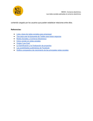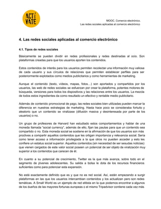 Las redes sociales se pueden dividir en profesionales y de ocio. Permiten recolectar información valiosa sobre los usuarios y sus relaciones para crear perfiles publicitarios. Además de contenido promocional de pago, las redes sociales bien utilizadas pueden marcar la diferencia en estrategias de marketing. Los usuarios comparten más aquellos contenidos que les otorgan importancia y relevancia social.