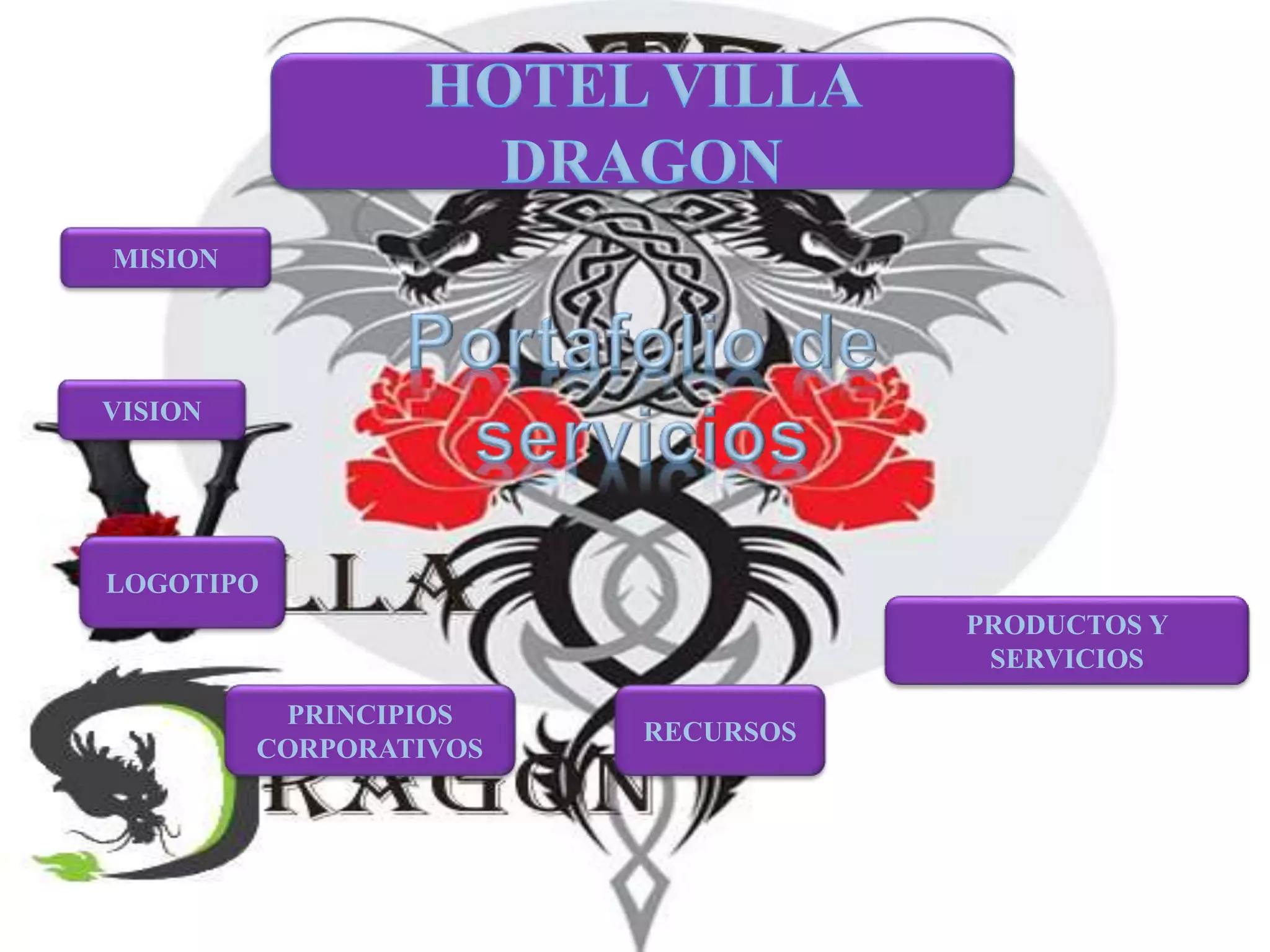 El documento describe los servicios y características del Hotel Villa Dragón. La misión del hotel es brindar hospedaje y satisfacer las necesidades de los clientes, mientras que su visión es convertirse en el mejor hotel de la región. El hotel ofrece varios servicios como habitaciones, restaurante, bar, spa, gimnasio, sala de reuniones y seguridad las 24 horas para garantizar la comodidad de los clientes.
