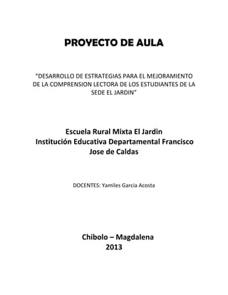 Este documento describe un proyecto de aula para mejorar la comprensión lectora de los estudiantes de la Escuela El Jardín en Chibolo, Magdalena. Actualmente los estudiantes tienen dificultades para comprender lo que leen. El proyecto busca identificar este problema y desarrollar estrategias como la creación de un centro de lectura y talleres de lectura para elevar las habilidades de comprensión de los estudiantes.
