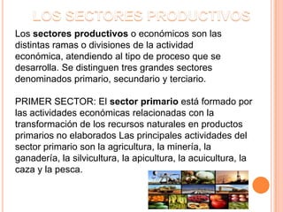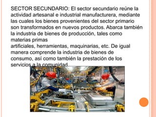 El documento describe los cuatro sectores económicos: el sector primario incluye actividades como la agricultura y la minería; el sector secundario transforma los productos primarios en nuevos productos manufacturados; el sector terciario ofrece una amplia gama de servicios a las personas y empresas; y el sector cuaternario se enfoca en actividades relacionadas con la información y su gestión y distribución.