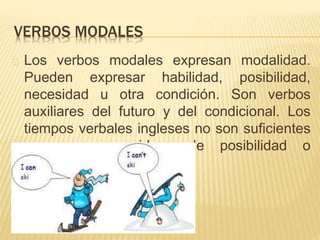 Este documento describe varios verbos modales en inglés como can, can't, should, shouldn't, must, mustn't, may, might, mayn't, mightn't, would y have to. Estos verbos modales se usan para expresar habilidad, posibilidad, necesidad u otras condiciones y son auxiliares del futuro y condicional, ya que los tiempos verbales en inglés no son suficientes para expresar ideas como posibilidad o incertidumbre.