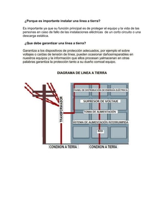 Instalar una línea a tierra es importante para proteger el equipo y la vida de las personas en caso de fallas eléctricas como cortocircuitos o descargas estáticas. Una línea a tierra garantiza dispositivos de protección adecuados contra sobrevoltajes o caídas de tensión que pueden dañar equipos e información de forma irreparable, protegiendo tanto a las personas como al equipo.