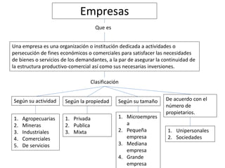 El documento describe las empresas. Define una empresa como una organización dedicada a actividades económicas para satisfacer las necesidades de bienes o servicios de los clientes y asegurar la continuidad de la estructura productiva y las inversiones necesarias. Además, clasifica las empresas según su actividad, propiedad, tamaño y número de propietarios.