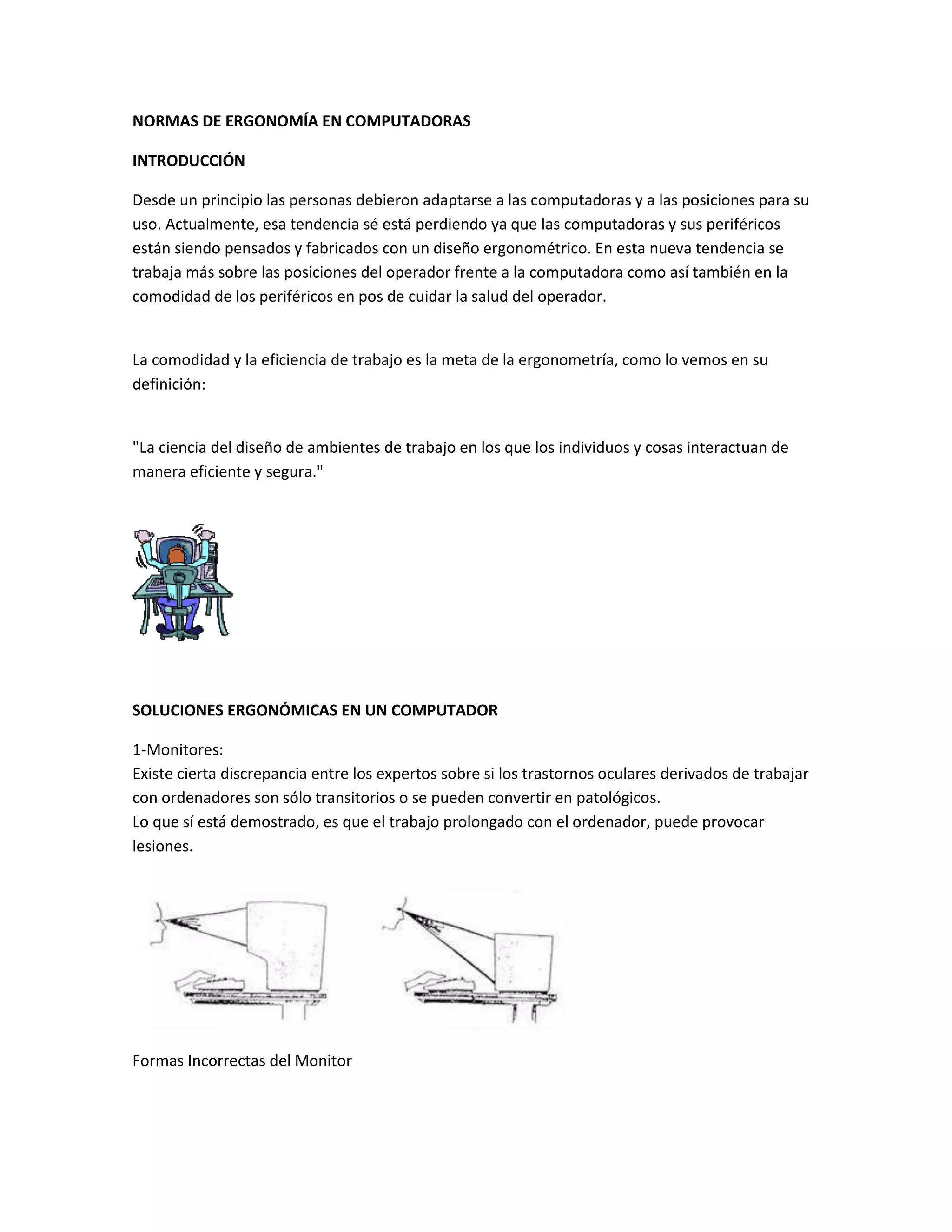 Este documento presenta normas de ergonomía para el uso de computadoras, incluyendo recomendaciones para monitores, teclados, mouse y mobiliario. Se enfatiza la importancia de adoptar posturas correctas, realizar pausas frecuentes, controlar la iluminación y evitar reflejos para prevenir lesiones y fatiga visual u otros problemas de salud asociados al uso prolongado de computadoras.