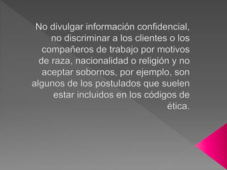 El documento describe la estructura y propósito de un código de ética profesional universal. Un código de ética declara los valores fundamentales de una profesión, le da identidad y rol social, e informa a la sociedad sobre sus criterios éticos. También diferencia los actos lícitos de los ilícitos y guía decisiones éticas mediante valoraciones de situaciones específicas. Además, protege a la profesión de amenazas externas.