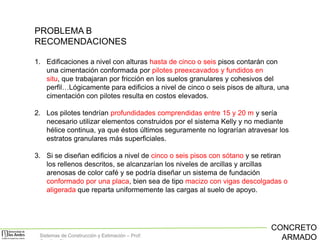 El documento resume los sistemas de construcción y estimación para proyectos de concreto armado. Explica que las cimentaciones para edificios de 5-6 pisos requerirán pilotes de 15-20 m de profundidad, mientras que para edificios más altos los pilotes serán más profundos, hasta 45-50 m para edificios de 15-20 pisos. También describe los métodos para excavaciones de sótanos, incluyendo el uso de muros pantalla y placas de contrapiso. Finalmente, resume los principios básicos del concreto in situ,
