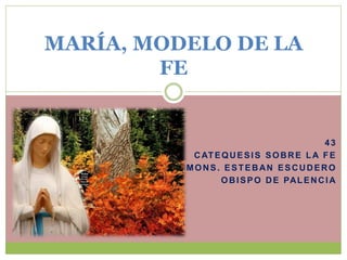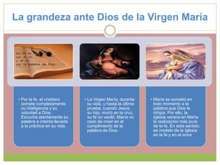 El documento describe a María como un modelo de fe para los cristianos. Resalta cómo María aceptó sin vacilar la voluntad de Dios en la Anunciación, criando a Jesús, y permaneciendo junto a la cruz. También destaca que María ofrece consuelo y protección a la fe de la Iglesia, y que a través de su Asunción al cielo continúa intercediendo por los creyentes. El documento concluye que María se ha convertido en el modelo de fe para cumplir la voluntad de Dios.