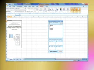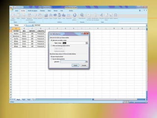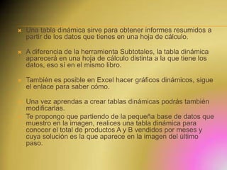 El documento explica cómo crear tablas y gráficos dinámicos en Excel utilizando los datos de una hoja de cálculo. Describe los pasos para generar una tabla dinámica que muestre el total de productos vendidos por mes a partir de una base de datos de ejemplo. También indica cómo crear gráficos dinámicos vinculados a la tabla para visualizar mejor los datos.
