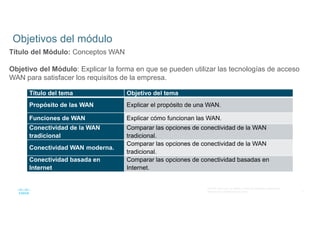 El documento describe los conceptos y propósitos de las redes de área amplia (WAN), su funcionamiento, topologías disponibles y la evolución de las redes según el crecimiento empresarial. Se compara la conectividad de WAN tradicionales y modernas, además de los estándares y protocolos empleados en estas redes. Se enfatiza en la importancia de elegir la infraestructura adecuada para satisfacer las necesidades cambiantes de las organizaciones.