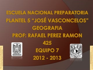 El documento presenta información sobre el espacio geográfico del Distrito Federal de México. Describe su ubicación, límites, relieve, clima, flora, fauna y actividades económicas. El Distrito Federal tiene una extensión de 1,485 km2 y una población de 8,864,370 habitantes. Su relieve incluye sierras, lomeríos y valles, y su clima es mayormente templado subhúmedo. Las principales actividades económicas son el comercio, la industria y los servicios.