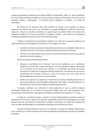Este documento describe un proyecto de colaboración entre universidades iberoamericanas para desarrollar un sistema virtual de diagnóstico de conocimientos, destrezas y estilos de aprendizaje de estudiantes universitarios de ciencias. El objetivo es mejorar la educación científica mediante la identificación de factores que predicen el éxito académico y la mejora de los programas de estudios preuniversitarios. Como parte del proyecto, se han creado instrumentos de diagnóstico en comprensión conceptual, destrezas cientí