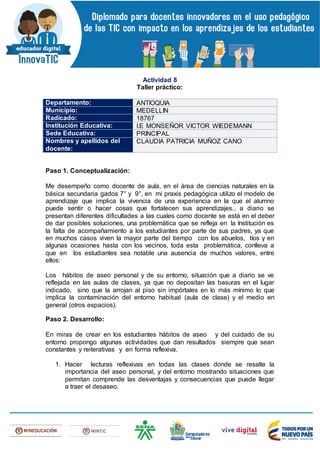 El documento describe un plan para crear hábitos de aseo personal y del entorno en los estudiantes. La autora propone realizar lecturas reflexivas sobre la importancia del aseo, elaborar carteleras con mensajes, celebrar el día del medio ambiente con actividades educativas, y implementar un proyecto de reciclaje, con el fin de mejorar los hábitos de los estudiantes y la imagen de la institución educativa.