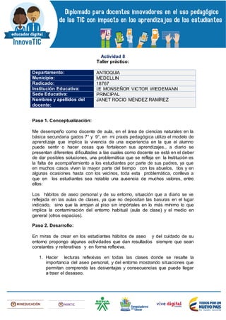 Este documento describe las actividades que una maestra propone implementar para crear hábitos de aseo personal y del entorno en sus estudiantes. La maestra nota que los estudiantes carecen de valores como el aseo debido a la falta de acompañamiento de sus padres. Ella planea realizar lecturas reflexivas, carteleras con mensajes, celebrar el día del medio ambiente con videos ecológicos y desfiles, y continuar el proyecto de reciclaje, para crear conciencia sobre la importancia del cuidado personal y ambiental. Ella concluye que estas activ