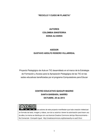 Este documento presenta un proyecto pedagógico desarrollado en el Centro Educativo Quigupi Madrid en Santa Bárbara, Nariño, Colombia. El proyecto busca formar una cultura del reciclaje en los estudiantes de cuarto grado a través del uso de las TIC. El proyecto consta de varias fases que incluyen la planificación, investigación sobre el reciclaje, y actividades de aprendizaje lúdicas y pedagógicas para enseñar a los estudiantes sobre la importancia del recic