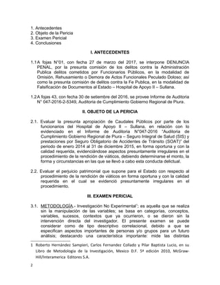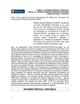 1) El perito contable realizó un examen de los documentos relacionados a presuntos actos irregulares en la rendición de viáticos por parte de funcionarios del Hospital de Apoyo II en Sullana. 2) Se identificaron incumplimientos a la normativa en materia de administración financiera pública respecto a la transparencia, legalidad y documentación sustentatoria. 3) El perito determinó que existe un presunto perjuicio económico al Estado debido a posibles irregularidades en el procedimiento de rendición de viáticos.