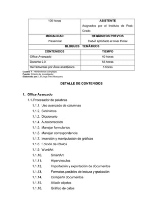 Este documento describe un módulo de capacitación sobre herramientas TIC complejas a nivel intermedio. El módulo se centra en el uso avanzado de Office, herramientas docentes 2.0 como blogs y wikis, y herramientas específicas de diferentes áreas académicas. El curso dura 100 horas y se llevará a cabo de forma presencial en un laboratorio de informática para 20 participantes.