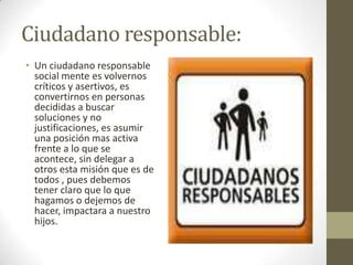 El documento presenta cuatro secciones sobre la ciudadanía responsable, los sistemas tecnológicos, el uso de sistemas tecnológicos y la tecnología inadecuada. La ciudadanía responsable implica ser crítico y proactivo para buscar soluciones en lugar de justificaciones. Un sistema tecnológico se refiere al conjunto de elementos que contextualizan la acción técnica humana. La tecnología adecuada maximiza los recursos disponibles para el bienestar social, mientras que la tecnología inadecuada genera depend
