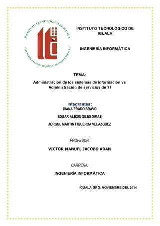 Este documento compara la administración de sistemas de información y la administración de servicios de TI. Explica que la administración de servicios de TI se enfoca en alinear los servicios de tecnología con las necesidades empresariales desde la perspectiva del cliente final. También describe que ITIL es un marco ampliamente aceptado para la administración de servicios de TI y que proporciona beneficios como orientar la estrategia de TI con la estrategia del negocio e incorporar las necesidades de los usuarios en las prioridades.