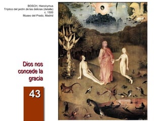 La gracia es un don sobrenatural y gratuito de Dios que nos permite participar de su vida divina y alcanzar la salvación. Existen dos tipos de gracia: la gracia santificante que nos hace justos e hijos de Dios, y la gracia actual que ilumina nuestro entendimiento y mueve nuestra voluntad para hacer el bien. Dios concede a todos la gracia necesaria para salvarse, aunque depende de nuestra correspondencia a esa gracia. Los sacramentos y la oración son medios para aumentar la gracia recibida.