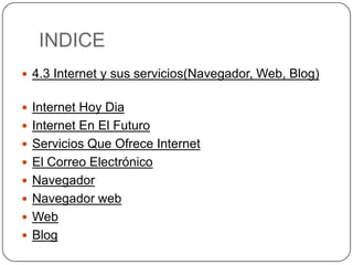 Este documento describe varios servicios de Internet como el correo electrónico, los navegadores, la web y los blogs. Explica que el correo electrónico permite enviar y recibir cartas electrónicas entre usuarios de todo el mundo. Los navegadores son software que permite visualizar páginas web almacenadas en servidores. La web consiste en páginas de información en formato HTML accesibles a través de un navegador. Los blogs son sitios web que permiten publicar contenido de forma periódica.